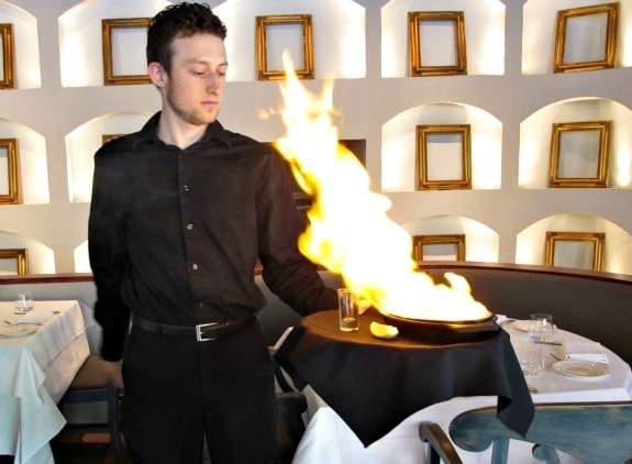 Saganaki Cheese – This Kefalotyri sheep’s milk cheese is flamed tableside with brandy and lemon. This traditional Greek dish is a big favorite with me.