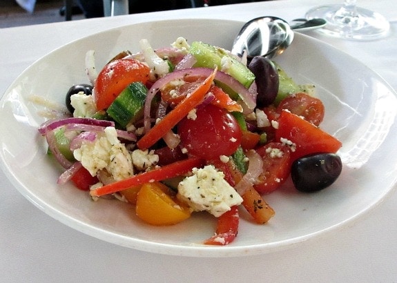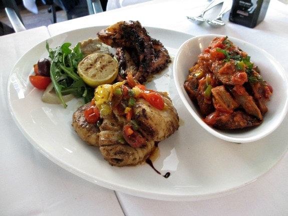 Tasting Platter of Calamari, Octopus, and Septzofai – A good-sized calamari steak, grilled with tomatoes, capers, oregano, lemon, olive oil, and fig, served with a balsamic reduction sauce. Tender and tasty, but the presentation fell flat. The Moroccan octopus, simply grilled with a brushing of olive oil, was tender and delicious. Even if you’re not an octopus fan, give this a try – you might be converted. The Spetzofai, roasted spicy lamb sausages served with bell peppers, tomato sauce, and mint, is the signature dish of Volos. It’s not overly spicy, so if you don’t like the heat, I think you’ll still enjoy these sausages. The tasting platter was served with a 2012 Assyrtiko “Santorini” Boutari from Santorini, Greece. It was pleasant, complemented the grilled items, but was mostly unremarkable.