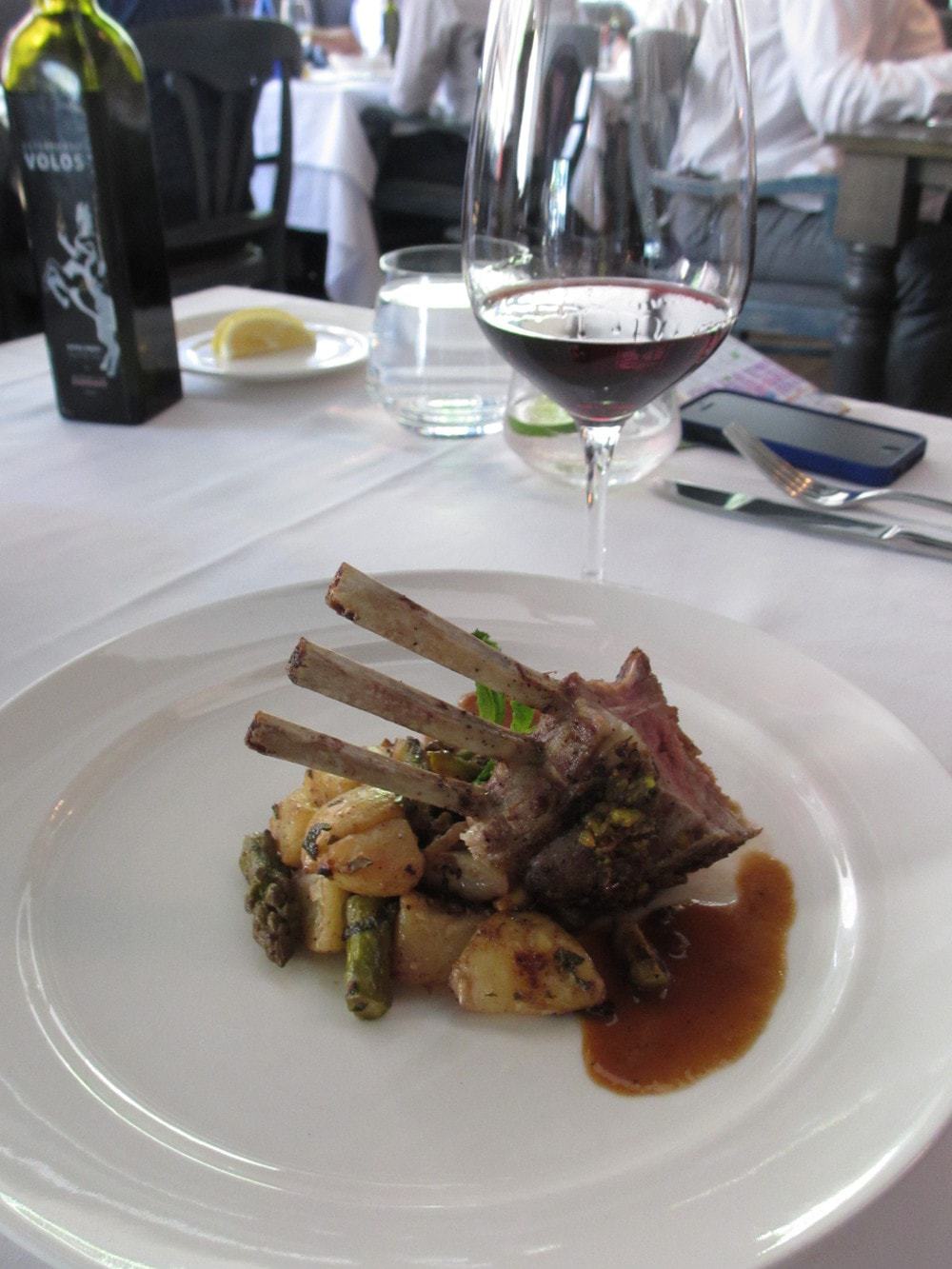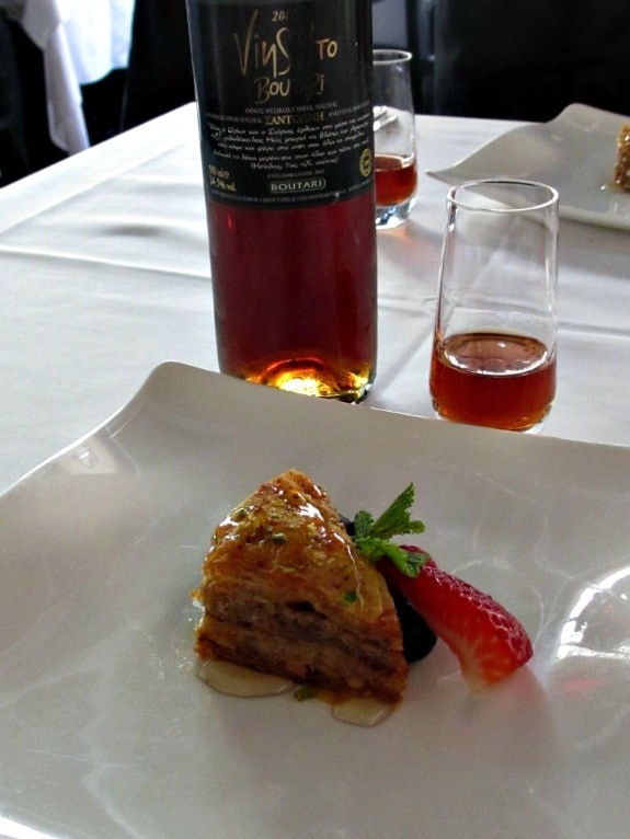 Pistachio Encrusted Rack of Lamb – This entrée is served with warm red potato salad with caper berries, asparagus, Kalamata olives and a mint vinaigrette. I thought the lamb was overdone, but the presentation was nice and it may have been an anomaly. The salad and lamb were paired with a 2011 Agiorgitiko”Agiogitiko” Gaia from Nemea, Greece. It provided nice balance to the entrée flavors.