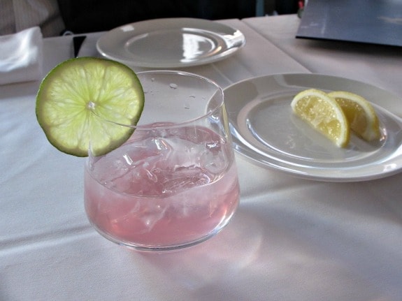 Sintorini Cocktail – Made with Skinos, a Greek liquor, and Red Passion Alize, lime juice, and soda, this pale pink concoction was a refreshing apertif to start the meal.